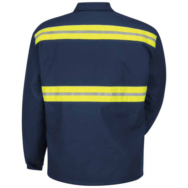 A job done safely is a job done right. Our enhanced visibility panel jacket comes with yellow/silver visibility strips, a permanent black quilted lining, and collar topstitching and stays to keep you both warm and in sight. And for those working a job that doesn't require safety garments compliant with ANSI 107-2004 or ANSI 107-2010 requirements, this poly/cotton, hip-length jacket comes with inset on-seam hand pockets to keep all your necessities on hand.