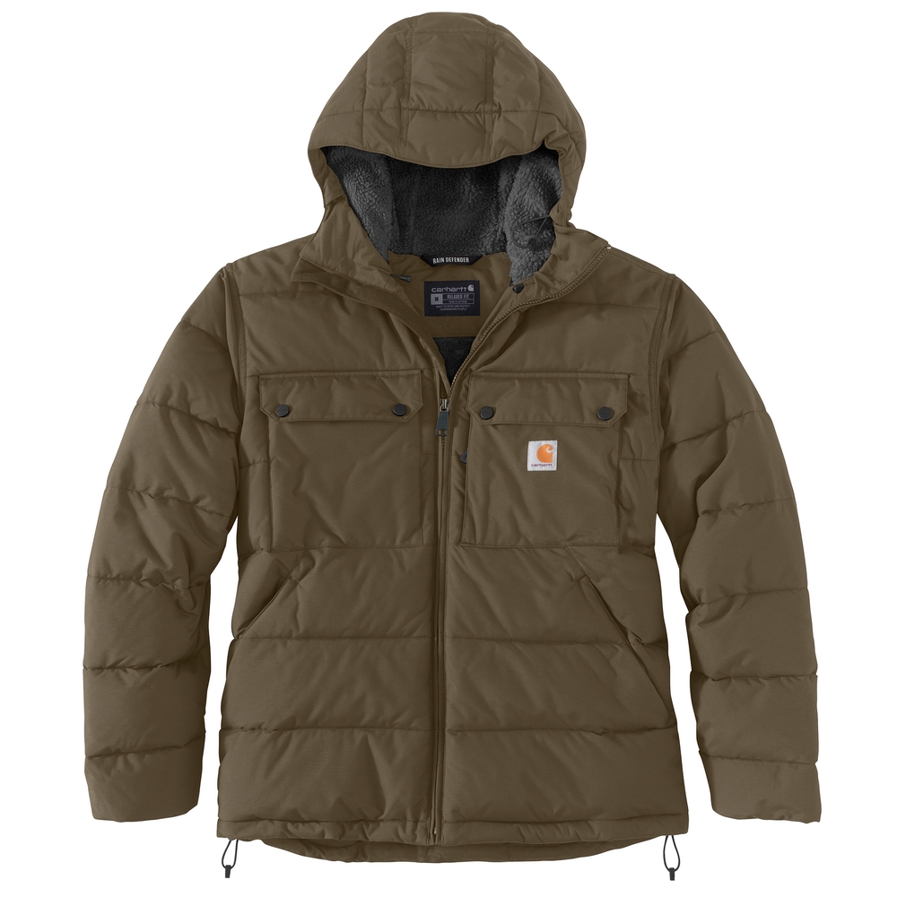 When the weather is cool and damp, this men's Carhartt rain jacket offers insulated warmth to keep you working. It blocks the wind and sheds light rain. Synthetic down insulation plus a sherpa fleece lining in the upper body seal in heat. Knit cuffs and an adjustable hood further seal out the cold as you bend and move. Pockets inside and out offer plenty of storage. A loose fit offers our roomiest cut.