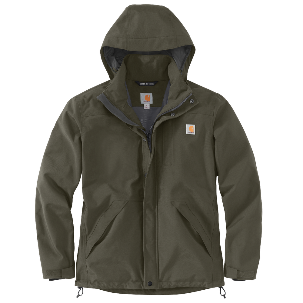 When your work takes you outside in all kinds of weather, this men's Carhartt jacket helps you get the job done. Waterproof and breathable Storm Defender keeps the rain out and moves away sweat. Cut with a loose fit so you can layer it over a sweatshirt.