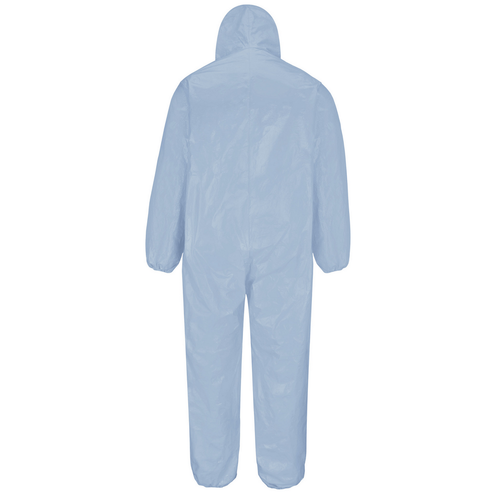 This one-piece disposable coverall with elastic-cinch sleeve ends provides a roomy fit and comes equipped with an oil and water repellent finish.