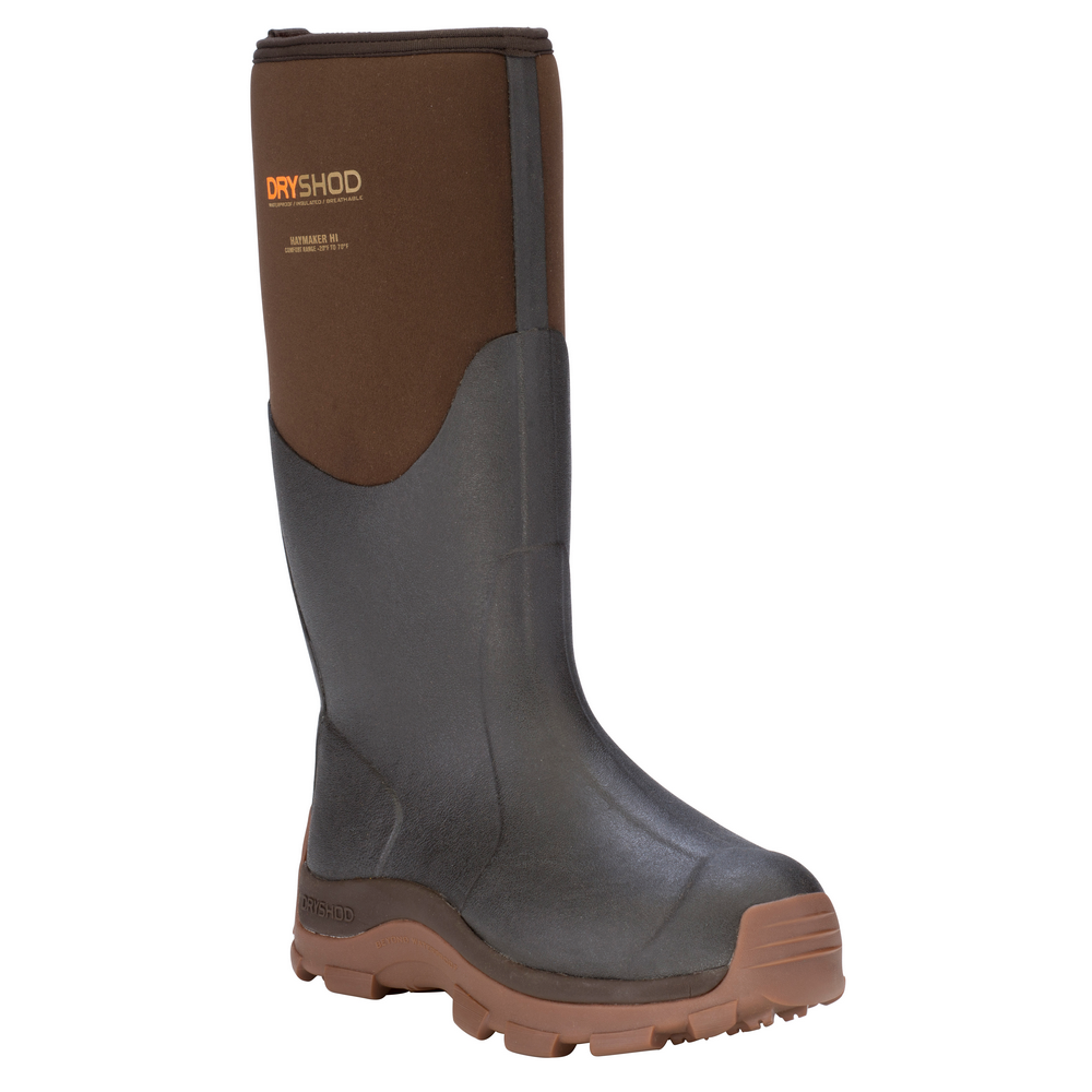 Hard-Working Farm Boot. Tough conditions call for a tough boot – the Haymaker is ideal for messy, rugged outdoor terrain! DS1 molded outsole for grip on rugged terrain. Compression molded non-pigmented gum rubber outsole and EVA mid-sole for comfort and cold-block. Removable molded EVA sock liner and nylon shank. Comfort range: -20°F to 75°F.