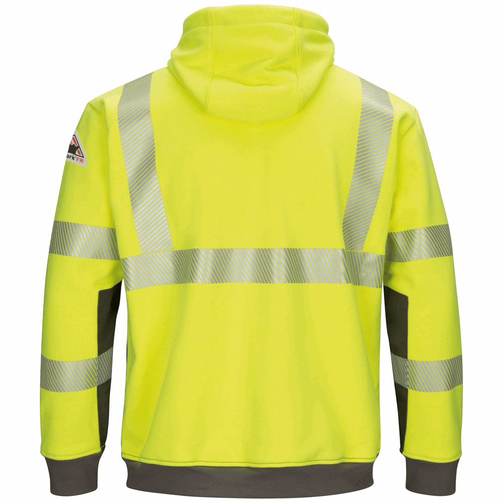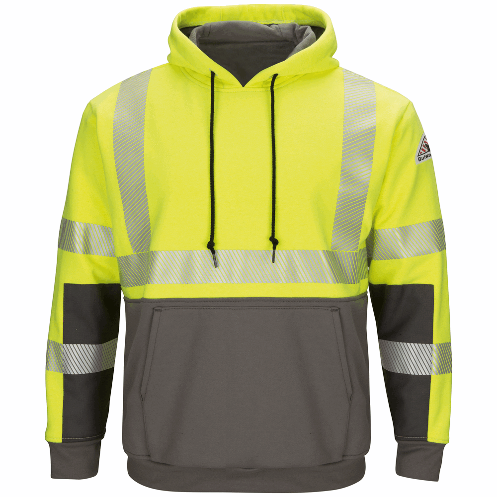 This color block hooded sweatshirt features updated styling to keep you warm when the days turn chilly. This FR hi-visibility pullover is made for warmth, comfort, and work. It features iQ Series® Endurance rip stop twill reinforcement on interiors of sleeves to increase durability. The sweatshirt is waffle lined for extra warmth, has a large hand pocket and a 3-piece hood with drawstring closure. This will quickly become your go-to sweatshirt for warmth and protection.