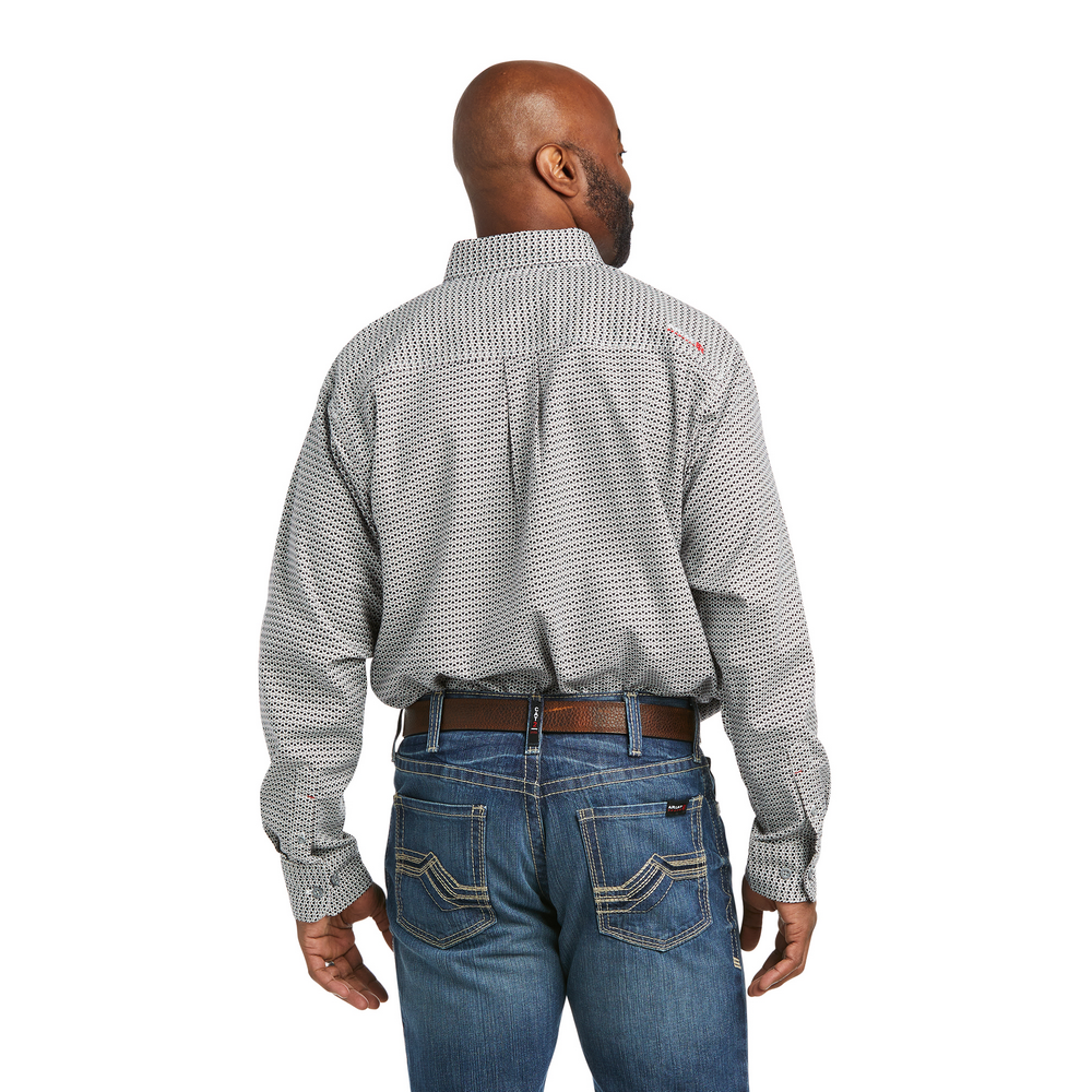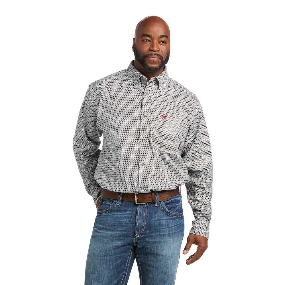 7 oz FR stretch print, Button-down front w/ left chest pocket, Button-down collar, Adjustable cuffs, 89% cotton, 9% nylon, 2% spandex