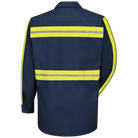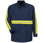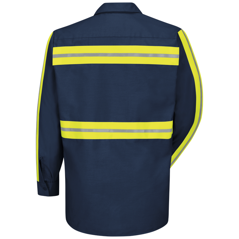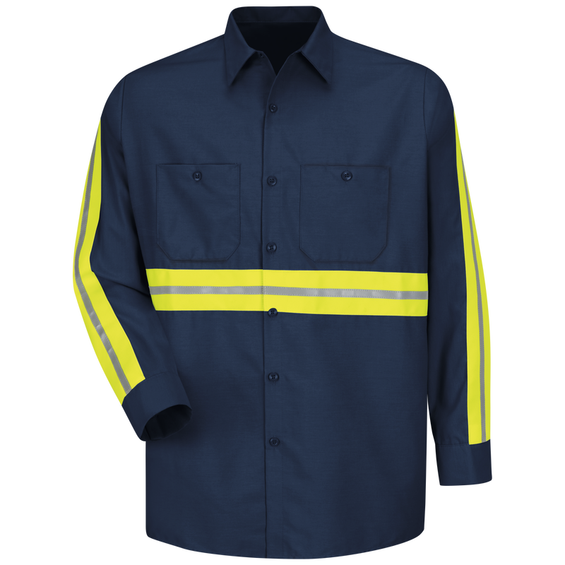 Sometimes you need to stand out more than your work. Our Enhanced Visibility Industrial Work Shirt comes in a professional grey with yellow/silver/yellow reflective striping to make sure you stand out from your surroundings. The shirt also comes with a two-piece, lined collar with sewn-in stays, a button-front closure, and two button-thru, hex-style pockets to complete your clean cut and practically look.