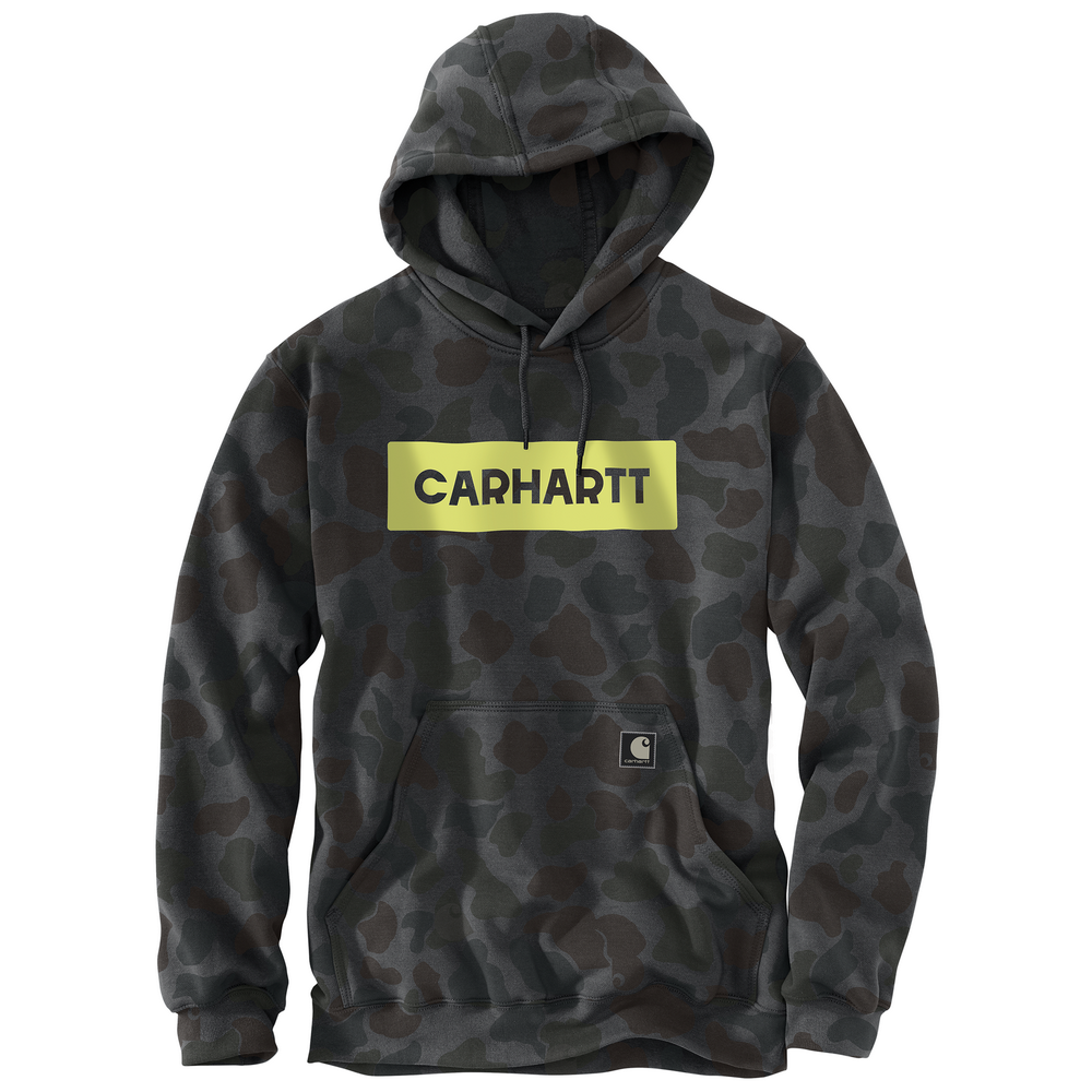 Camo's not just a print, it's a lifestyle. This men's hooded sweatshirt comes in midweight fleece with an allover camo print and comfortable loose fit. Featuring a handwarmer pocket on the front and Carhartt graphic on the chest.
