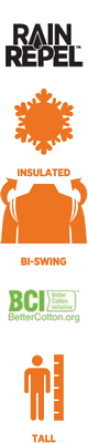Original fit, rugged ten–ounce cotton canvas, PRO signature bi-swing and articulated elbows for mobility, pouch pockets, zippered chest pocket, inside secured chest pocket, metal rivets for reinforcement, quilted nylon lining, adjustable sleeve and bottom hem snap closures, three-piece hood with drawstring closure, logo patch on front pocket.