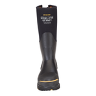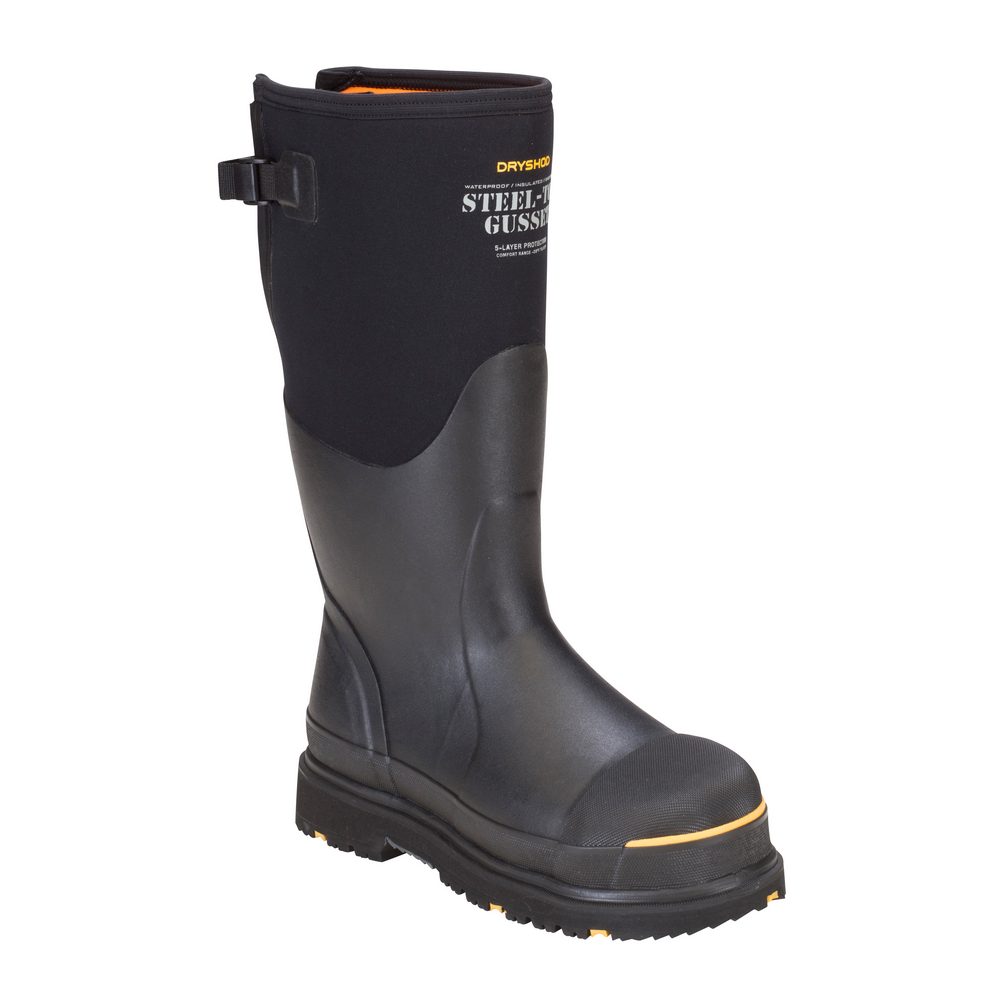 Adjustable Gusset Protective Work Boot. Safety matters! Steel-toe protection and all-day comfort! Customize to fit larger calves for optimum comfort and protection with our expandable gusset and adjustable locking strap. Extra room also accommodates layers of clothing being tucked into the boot. Solid rubber, long-wearing outsole for traction and durability. Special broad-toe last – 3 mm extra space. ANSI-rated steel toe for safety. Meets ASTM 2413-11 ansi z41 pt 99 and impact/75 compression/75 eh. Rigid triple-layer toe and heel reinforcements. Yellow treatments to indicate safety and steel shank for added arch support. Features unisex sizing. Comfort range: -10°F to 75°F.