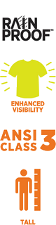 Original fit, rugged polyester shell with waterproof membrane featuring rainproof technology, three-piece hood, reverse entry front pockets, hook-and-loop sleeve adjustors, set-in-sleeves, radio loop attachments, 3m™ Scotchlite™ reflective heat transfer, meets ANIS/ISEA 107-2015 Type R class 3 visibility standards.