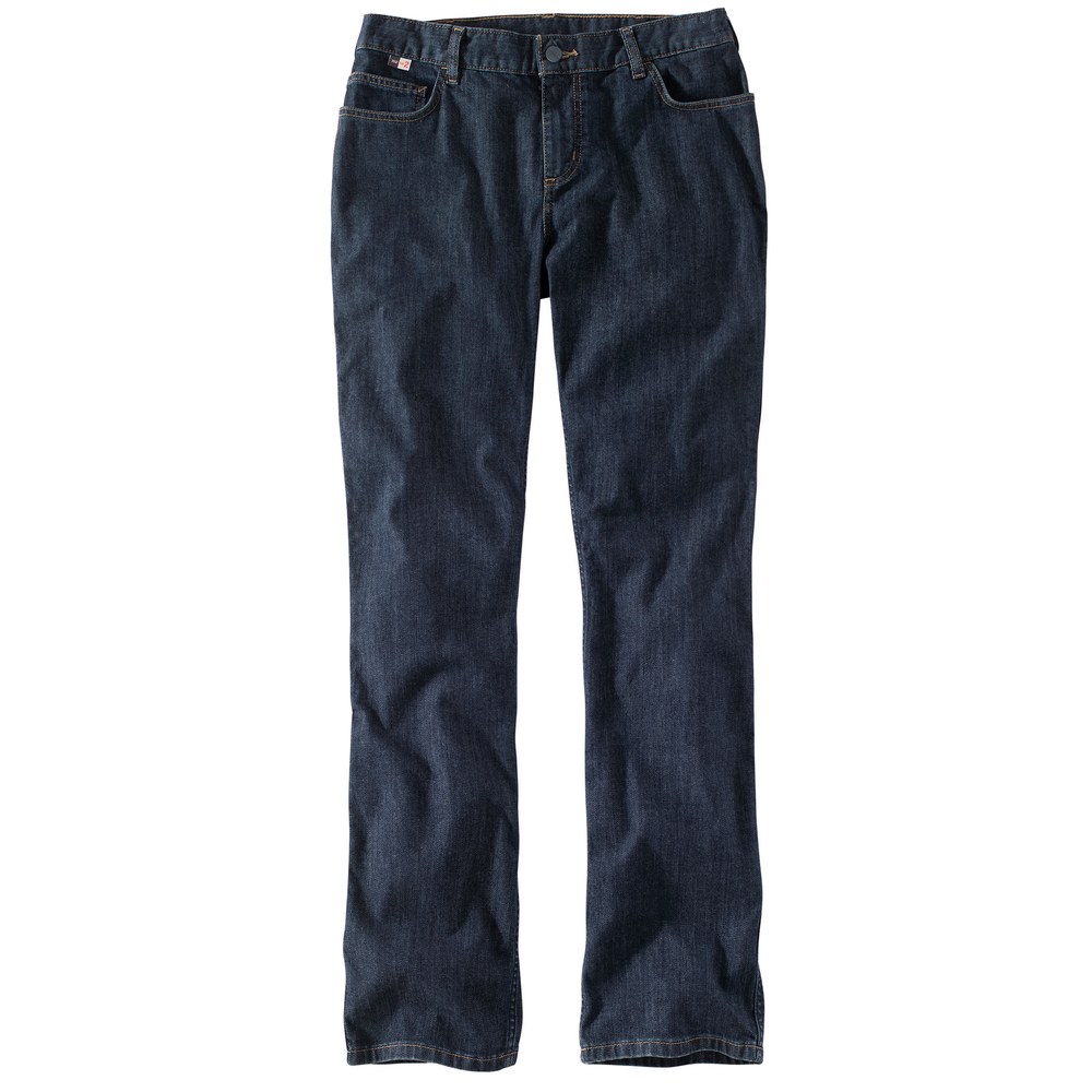 11oz., FR denim: 69% cotton 30% modacrylic 1% elastane, original fit, Rugged Flex durable stretch technology for ease of movement, mid front rise; sits just below the waist, higher back rise for added coverage, comfortable fit through hip and thigh, garment washed for soft finish, arc resistant button closure at waist, brass zipper fly with Nomex FR zipper tape, two reinforced back pockets, leg openings fit over boots, Carhartt FR label sewn on back pocket; NFPA 2112 cat 2 label sewn on waistband, meets the performance requirements of NFPA 70e and is UL classified to NFPA 2112.