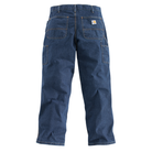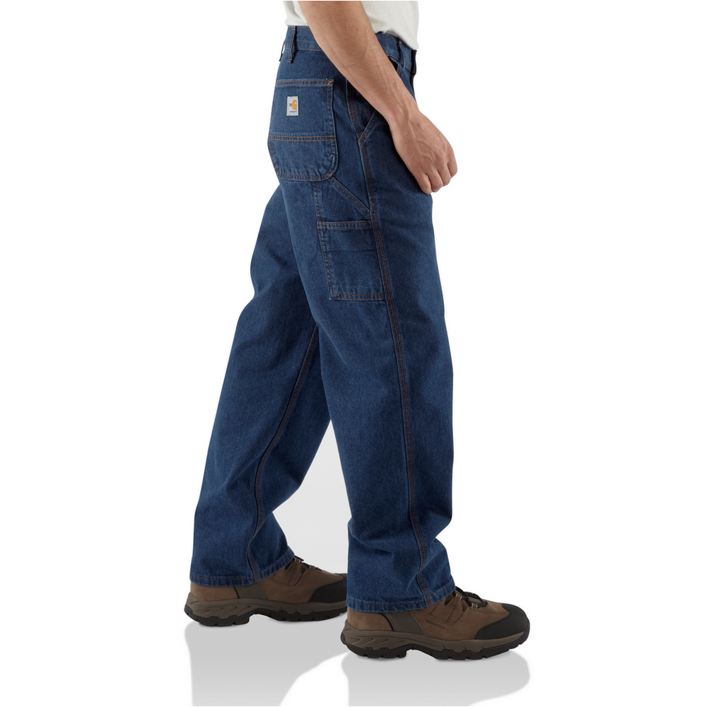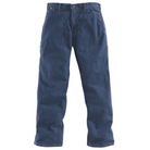 For flame-resistant protection in a high-quality jean that’s built to last, Carhartt's flame-resistant denim dungaree is a great workwear choice. 11.75-ounce, 100% cotton FR denim. Loose original fit sits slightly above the waist. Full seat and thigh. Garment washed for a soft finish. Arc-resistant button closure at waist. Brass zipper fly with nomex® FR zipper tape. Multiple utility pockets. Left-leg utility band. Triple-stitched main seams for durability. Straight leg opening fits over boots. Carhartt FR label sewn on back pocket; NFPA 2112/cat 2 label sewn on front waistband. Meets the performance requirements of NFPA 70e and is ul® classified to NFPA 2112