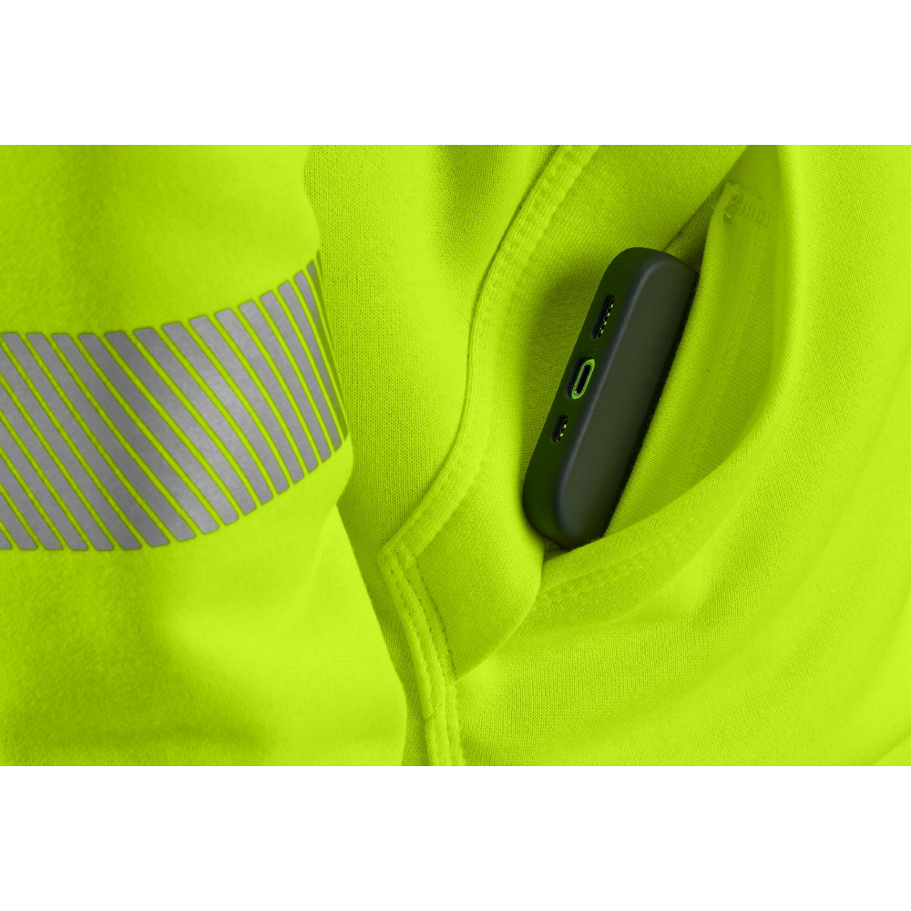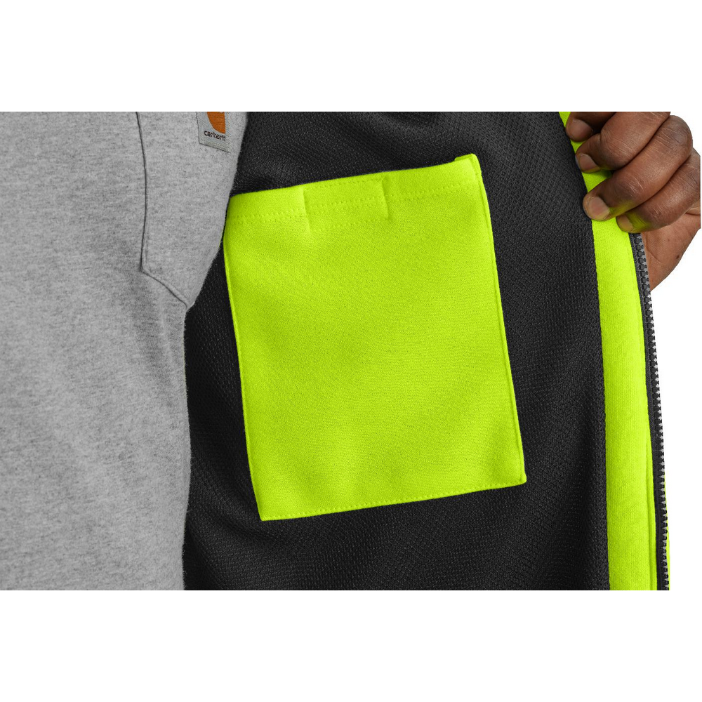 Stay warm in this men's Carhartt high-visibility sweatshirt that's ANSI Class E, Type R compliant. Made of midweight fleece with a loose cut and a thermal lining. Featuring a water-repellent finish to keep you dry through light rain and 3M™ Scotchlite™ reflective material that's segmented for breathability.