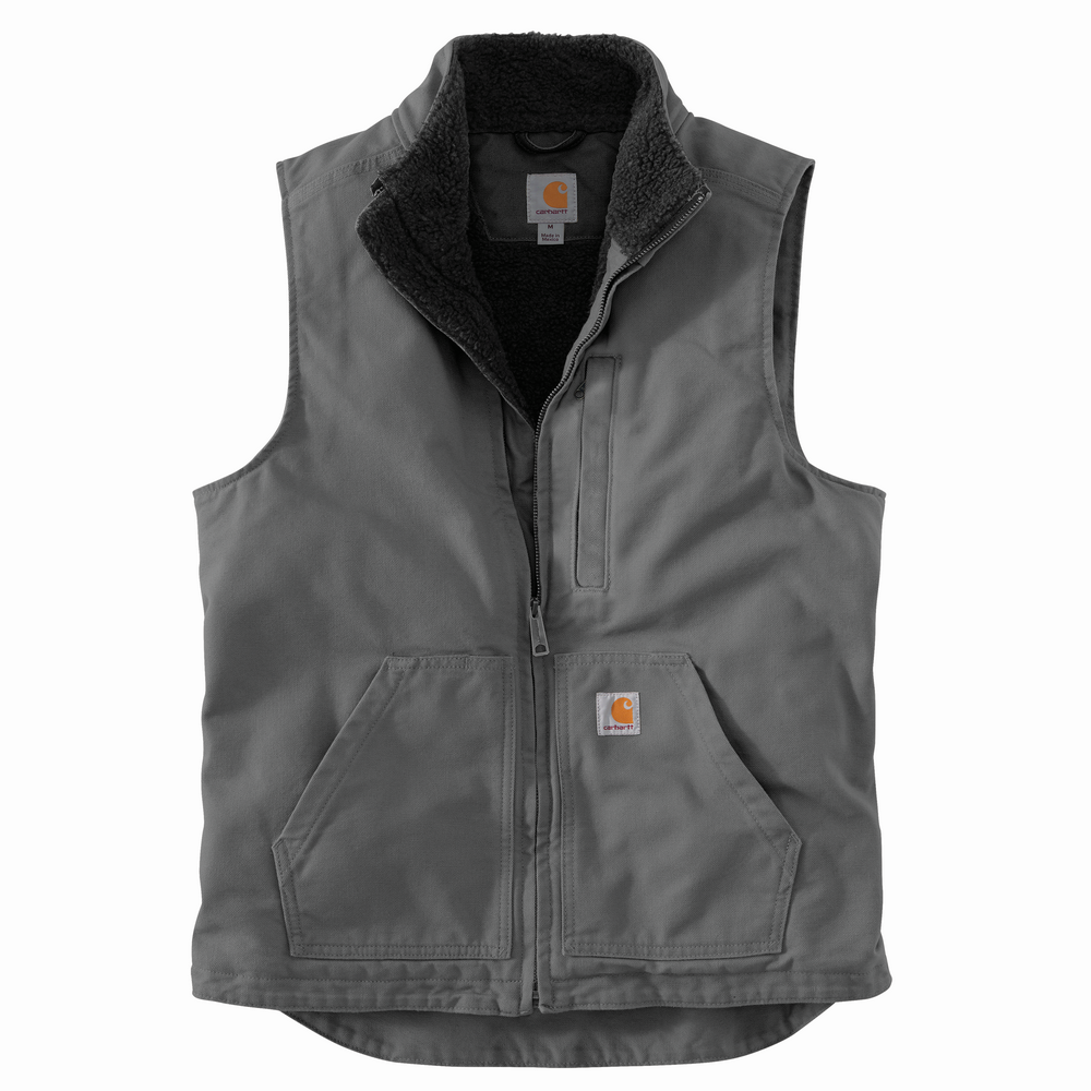 This men's fleece-lined canvas vest helps take the bite out of cold weather. Legendary Carhartt durability holds up to work, farm, and ranch wear, while a soft sherpa fleece lining offers everyday comfort. Multiple pockets give you plenty of storage options. ?5-ounce, 90% cotton / 10% polyester jersey ?Sherpa lining for warmth ?Relaxed fit ?V-neck ?Zip chest pocket ?Two inner pockets ?Tagless neck label for a smooth feel ?Imported