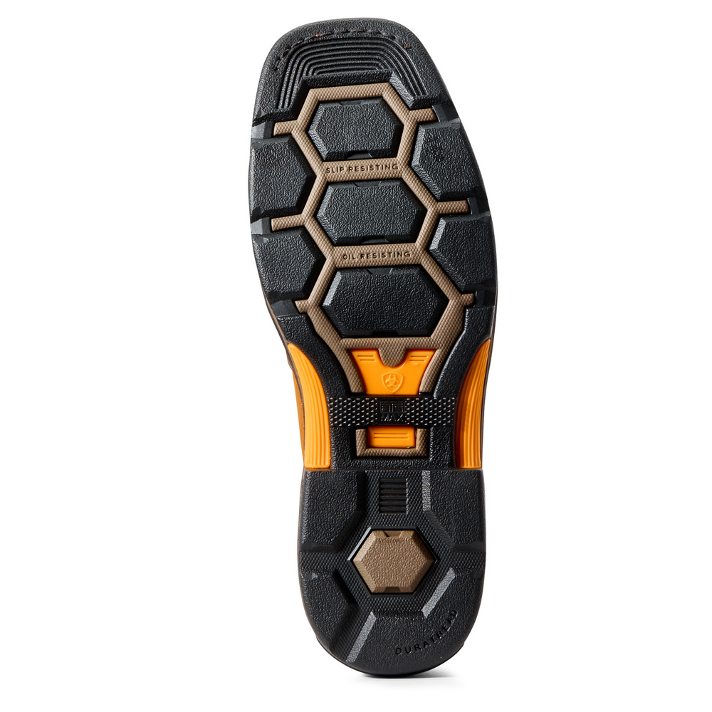 The work boot for the front-line work force is now available with a wide square toe. Constructed from premium full-grain leather and shaft detailed with a six-row stitch pattern and embroidery. Mesh lined for breathability and a 90-degree heel. Features Ariats patented U-Turn Entry System that is specifically designed to accommodate high arches and wide feet. The hidden gore panel in the back of the shaft provides just enough expansion to allow easy entry and removal of boots without compromising fit. Built on the OverDrive heavy-duty platform for maximum stability and superior protection in tough and treacherous working environments. Goodyear welt construction adds durability. ATS Max technology provides maximum support for tough tasks and long hours on your feet. An extra-wide shank delivers maximum torsional stability, promotes proper body alignment an minimizes foot fatigue. The EVA midsole and moisture-wicking, gel-cushioned footbed provide shock absorption and rebound for all-day comfort. The oil- and slip-resisting Duratread outsole provides wear and abrasion resistance. Reinforced ExGuards in key wear zones provide additional protection. The non-metallic Composite safety toe provides protection that is lighter weight than the traditional steel toe. ASTM F2413-11 M/I/75 C/75 EH rated for safety.