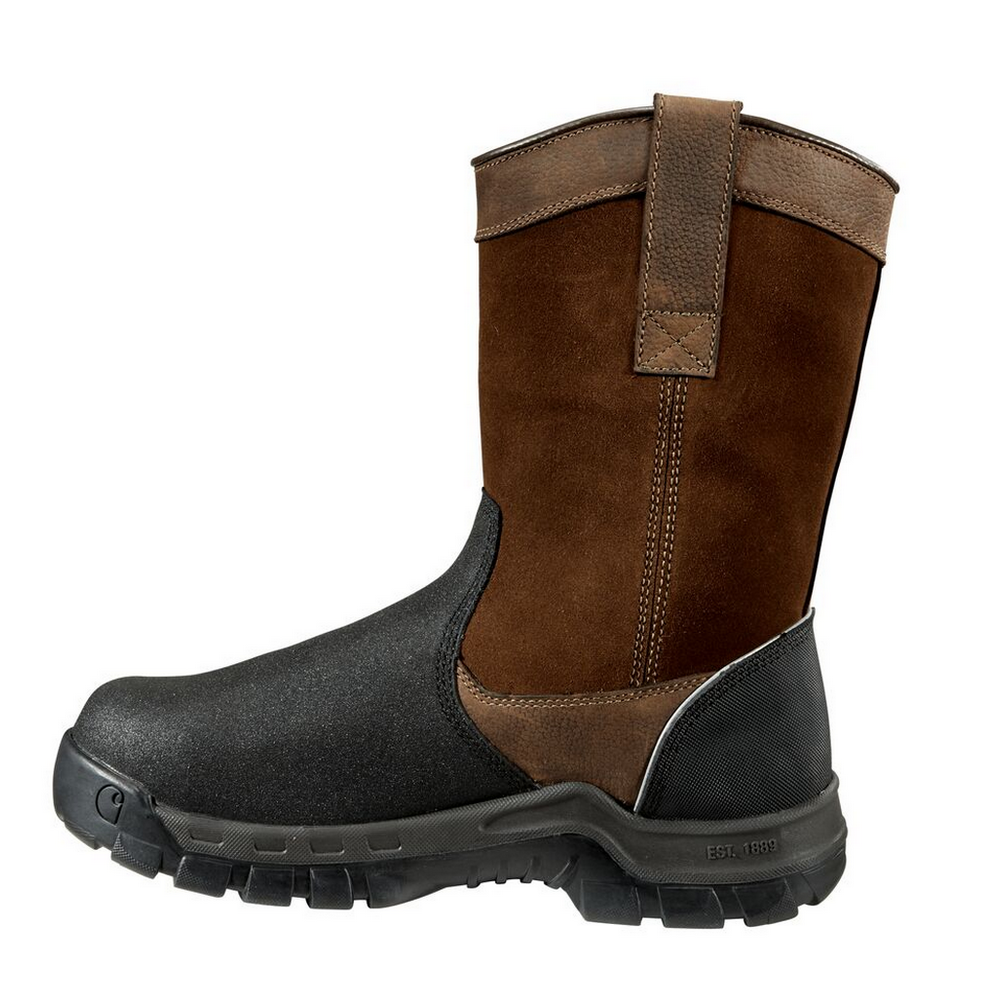 Carhartt Men's Rugged Flex 11 in. Wellington Waterproof Internal Met Guard Brown/Black Composite Toe CMF1721. Carhartt developed Met Guard work boots to provide extra protection for hard working men in the most demanding jobs. We put safety first when it comes to your feet. Internal Metatarsal Guard identifies protection against impact and compression hazards to the top of the foot with a metatarsal guard. Metatarsal styles meet ASTM F2413-18 MT standards. Carhartt rubber outsoles provide superior traction and Carhartt PU with Foam cushion insole provides comfortable support and reduces foot fatigue. Storm Defender Waterproof Breathable Protection is designed to be completely waterproof and to keep your feet dry in most types of wet conditions.