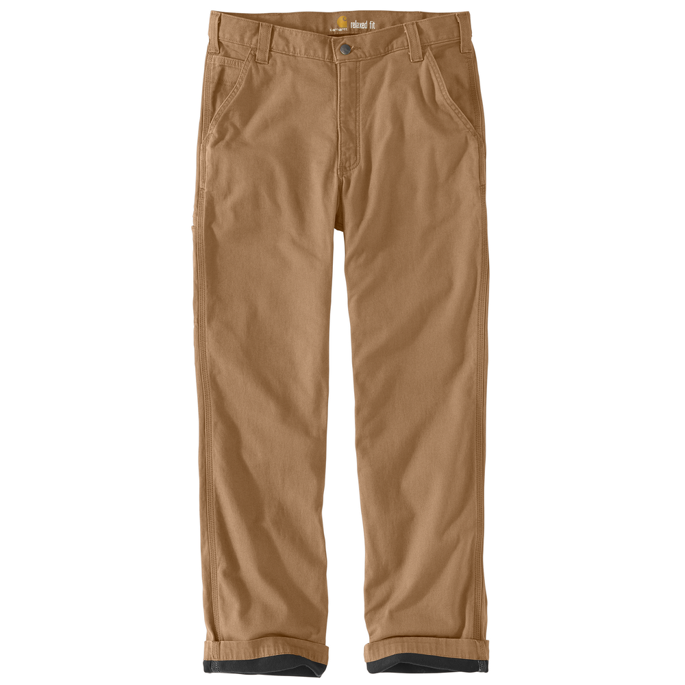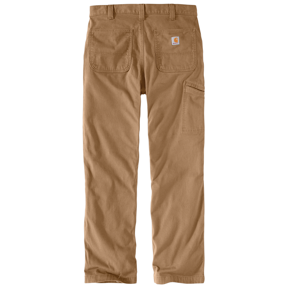 8oz., 98% cotton 2% spandex canvas, 2.3oz. 100% polyester knit flannel lining, Rugged Flex durable stretch technology for ease of movement, sits at the waist, relaxed seat and thigh, reinforced front slash pocket, stronger sewn on seam belt loops, right leg secured cell phone pocket, straight leg opening, imported.