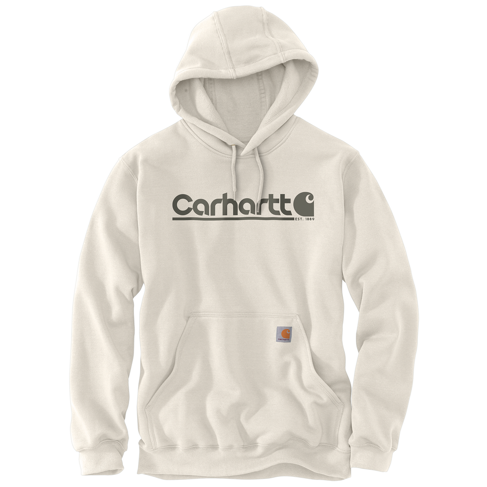 10.5-ounce, 59% cotton / 41% polyester • Loose fit • Attached three-piece hood with drawcord closure • Spandex-reinforced rib-knit cuffs and waist • Front handwarmer pocket • Carhartt logo graphic on chest • Carhartt label sewn on pocket • Imported