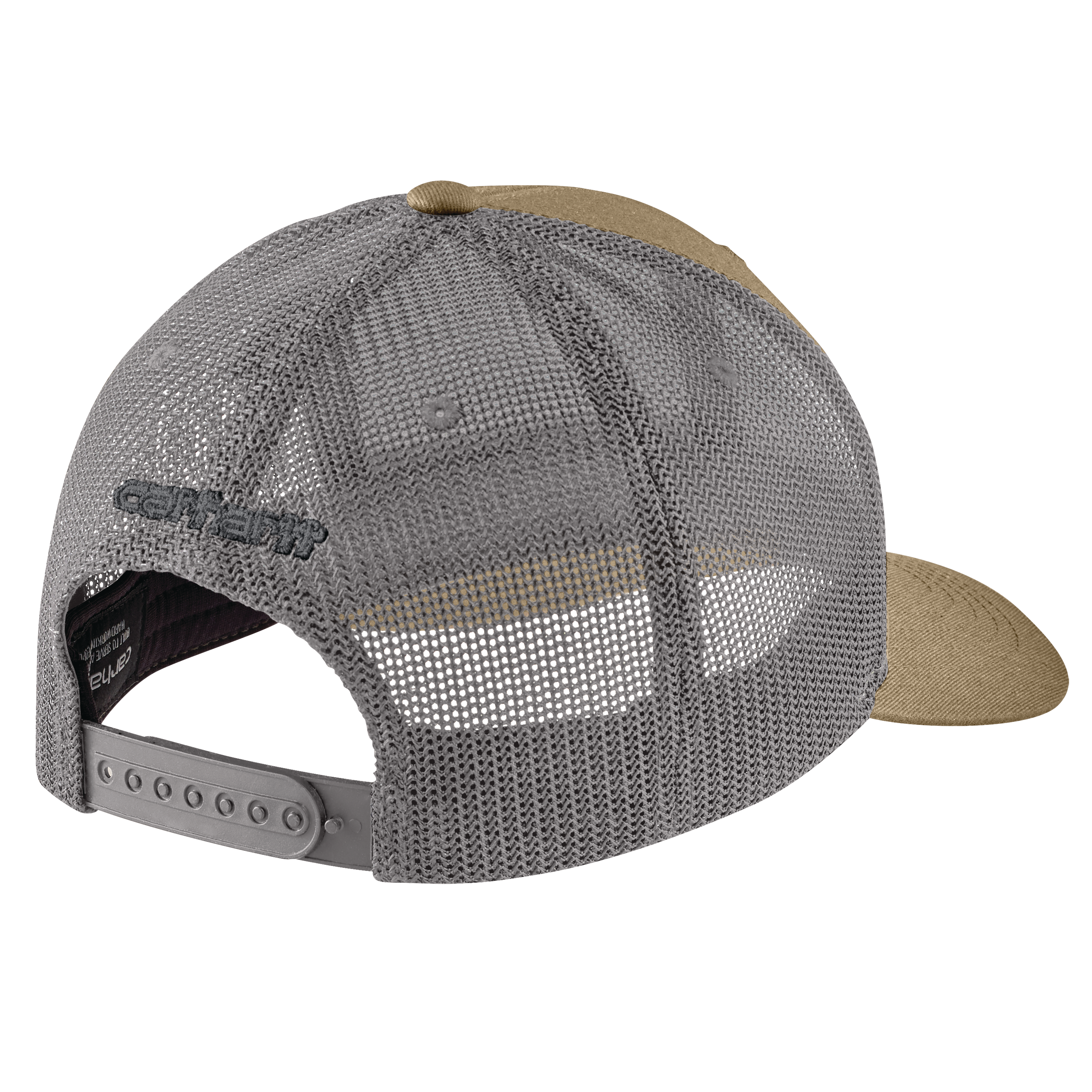 Built for a customized fit, this men's cap has extra stretch through the crown and sweatband as well as a snapback closure. Comfortable enough for warm days, it's made with a mix of durable twill and breathable mesh. Featuring a moisture-wicking sweatband and a rubberized Carhartt patch.